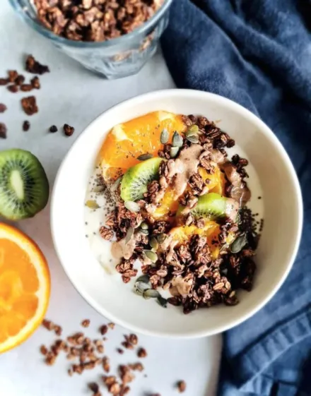Découvrez la recette de granola bowl au chocolat et aux agrumes d’Amandine Blachon, diététicienne spécialisée en sport, pour démarrer la journée avec énergie et gourmandise.